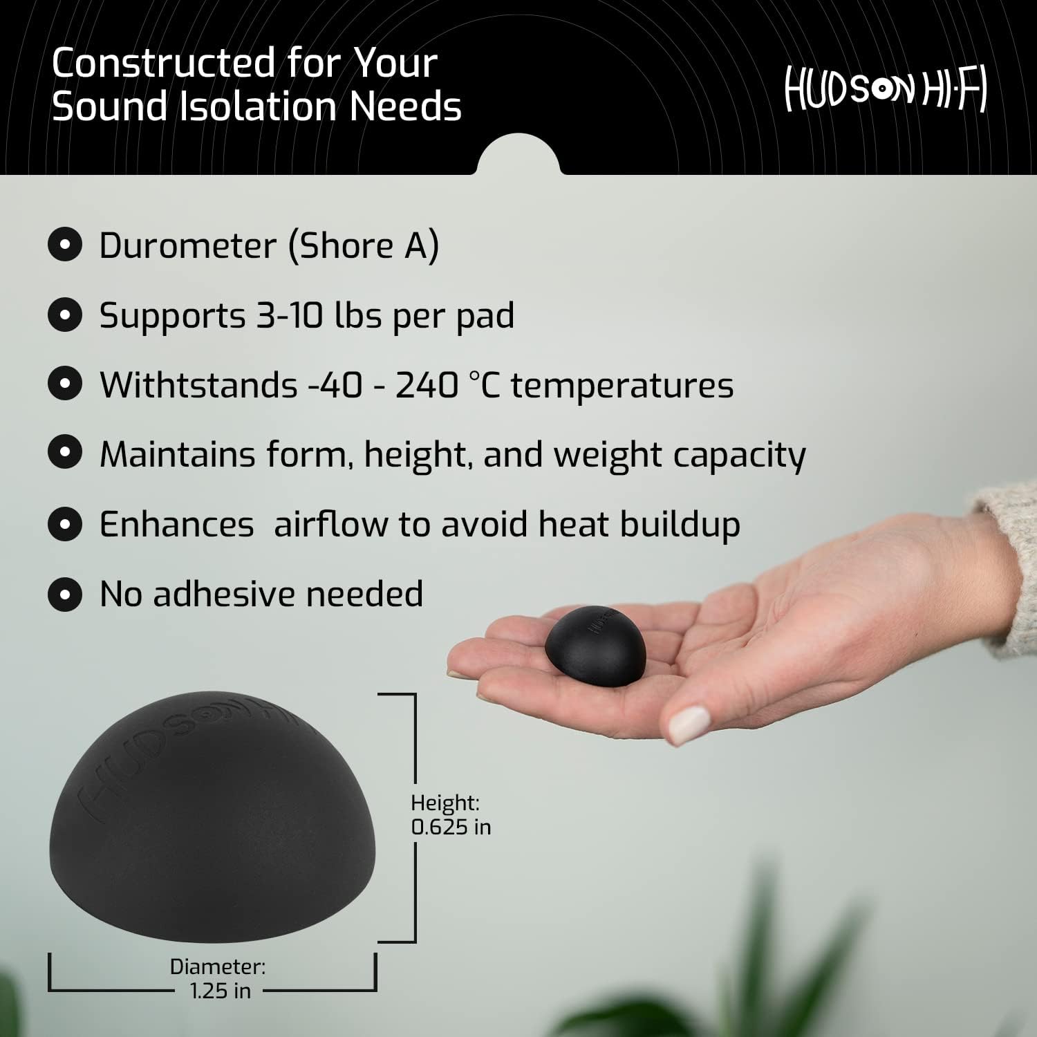 - Designed for Audiophiles & Casual Listeners: The Hudson HiFi Platinum Silicone Feet's sturdy Durometer 20 (Shore A) are perfect for 5-18 lbs components. Unlike solid stick on rubber feet, these won't scratch or ruin your device or surfaces. Each is 1.25" in diameter and 1.25" tall, and can withstand temperatures of -40°C ~ +240°C