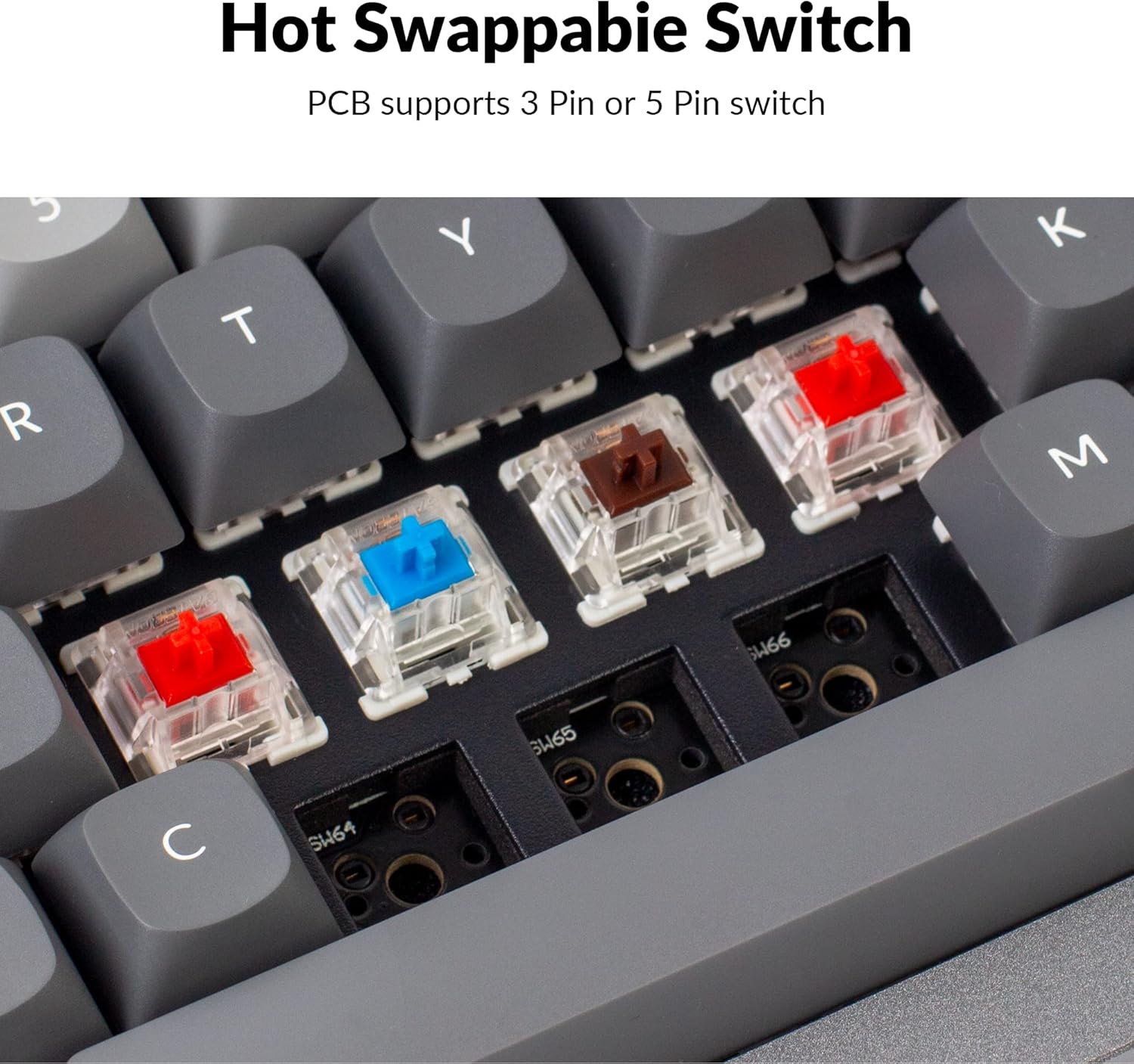 - You can hot-swap the Keychron Q2 with almost all of the 3pin and 5pin MX style mechanical switches on the market (including Cherry, Gateron, Kailh, Panda, etc.) without soldering required. while the pre-installed Gateron G Pro mechanical clicky blue switch providing unrivaled tactile responsiveness with up to 50 million keystroke lifespan. The PCB-mounted screw-in stabilizer for “big keys” such as space bar, shift, enter, and delete are designed for less wobbliness.