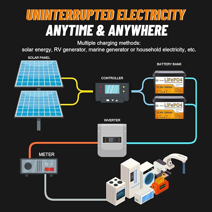 - 【Lightweight and Widely Use】Our 200Ah 12 volt lithium battery is 42.5 lb (only 1/3 weight of the same capacity lead acid batteries).With no acid in the battery, you're able to safely mount it in any position. Perfect choice for variety types of backup power application. Allow to be extended up to 4 in series and 4 in parallel to get more capacity and higher voltage (12V, 24V, 36V, 48V).