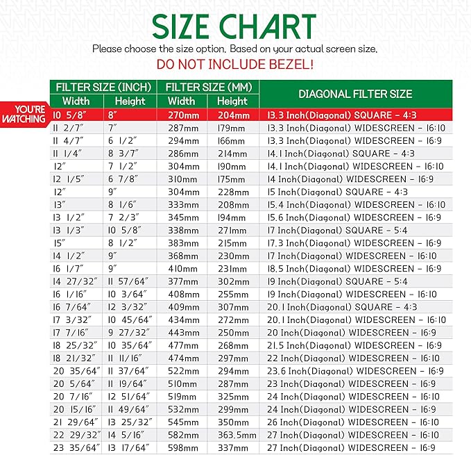 - ☘️ FILTER DIMENSIONS - Width: 10 5/8" (270 mm), Height: 8" (204 mm), Diagonal: 13.3" ANBAC ATTACHMENT TYPE PRIVACY SCREEN FILTER is compatible with all major brands such as HP, Dell, Samsung, Lenovo, LG, Acer, ASUS, ViewSonic, and the others. Please check your screen's width and height measurement in order to purchase the right filter for your screen size. (We advise that you DO NOT DECIDE your order only based on your screen’s diagonal size).