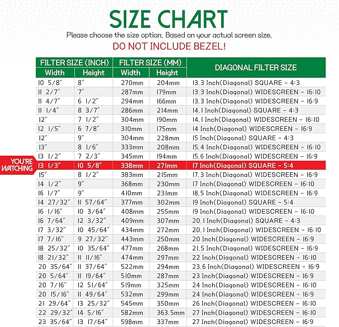 - ☘️ FILTER DIMENSIONS - Width: 13 1/3" (338 mm), Height: 10 5/8" (271 mm), Diagonal: 17" ANBAC ATTACHMENT TYPE PRIVACY SCREEN FILTER is compatible with all major brands such as HP, Dell, Samsung, Lenovo, LG, Acer, ASUS, ViewSonic, and the others. Please check your screen's width and height measurement in order to purchase the right filter for your screen size. (We advise that you DO NOT DECIDE your order only based on your screen’s diagonal size).