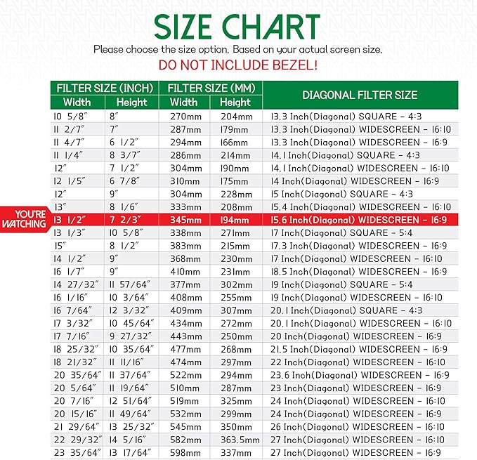 - ☘️ FILTER DIMENSIONS - Width: 13 1/2" (345 mm), Height: 7 2/3" (194 mm), Diagonal: 15.6"W9 ANBAC ATTACHMENT TYPE PRIVACY SCREEN FILTER is compatible with all major brands such as HP, Dell, Samsung, Lenovo, LG, Acer, ASUS, ViewSonic, and the others. Please check your screen's width and height measurement in order to purchase the right filter for your screen size. (We advise that you DO NOT DECIDE your order only based on your screen’s diagonal size).