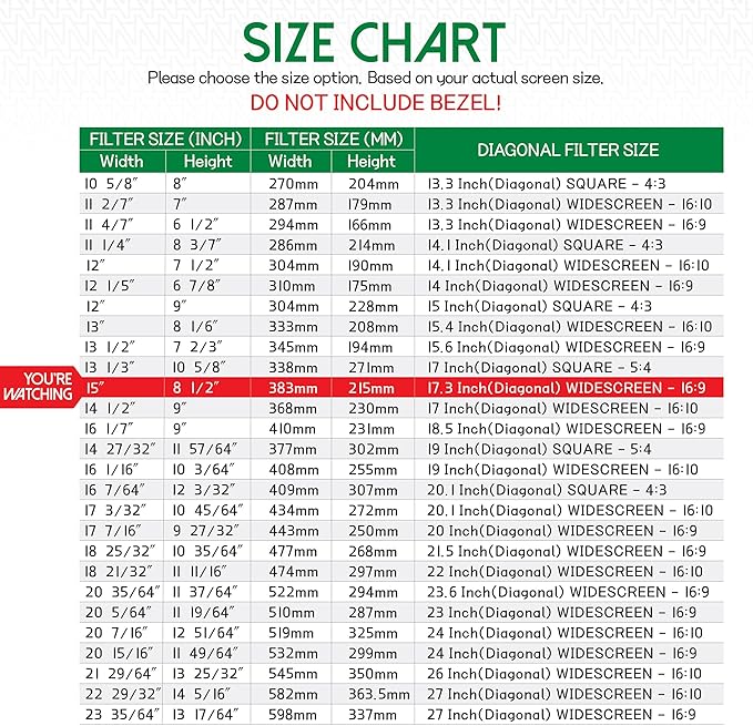 - ☘️ Filter Dimensions - Width: 15" (383 mm), Height: 8 1/2" (215 mm), Diagonal: 17.3"W9 ANBAC ATTACHMENT TYPE PRIVACY SCREEN FILTER is compatible with all major brands such as HP, Dell, Samsung, Lenovo, LG, Acer, ASUS, ViewSonic, and the others. Please check your screen's width and height measurement in order to purchase the right filter for your screen size. (We advise that you DO NOT DECIDE your order only based on your screen’s diagonal size).