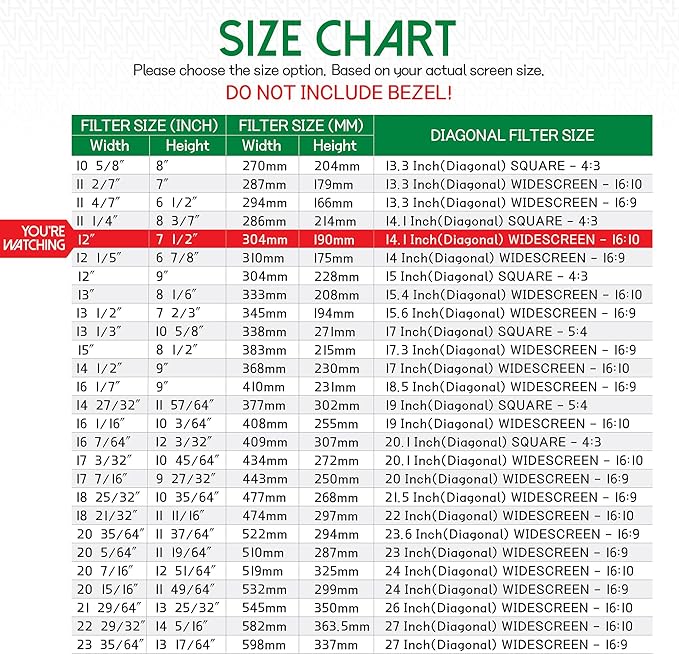 - ☘️ Filter Dimensions - Width: 12" (304 mm), Height: 7 1/2" (190 mm), Diagonal: 14.1"W ANBAC ATTACHMENT TYPE PRIVACY SCREEN FILTER is compatible with all major brands such as HP, Dell, Samsung, Lenovo, LG, Acer, ASUS, ViewSonic, and the others. Please check your screen's width and height measurement in order to purchase the right filter for your screen size. (We advise that you DO NOT DECIDE your order only based on your screen’s diagonal size).