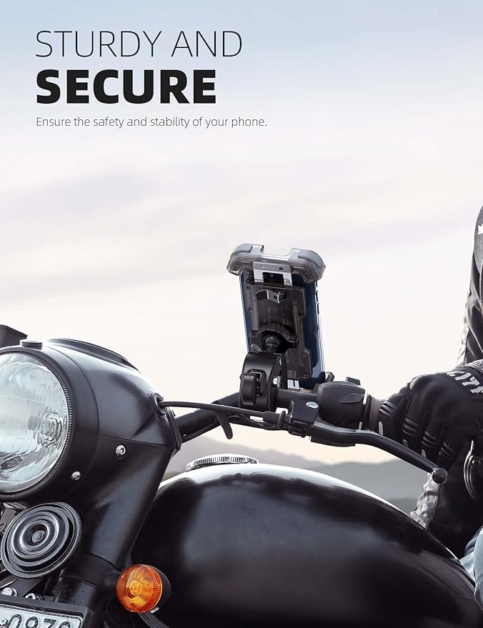- 【 All-around Protection】 The four corners and back of the motorcycle phone holder are all equipped with non-slip silicone pads, keep your cell phone from scratching and slipping, ensure the safety even on rough roads. The max height/ width of the phone clamp is 6.61" (168mm)/ 3.11" (79mm), for Galaxy S25 ultra, S24 ultra series with a case, it may can't fit.