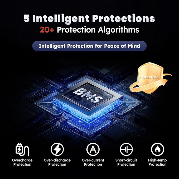 - 【Top-notch BMS Security Protection】 The built-in hardware-version 100A BMS protects the 12V 100Ah Pro LiFePO4 battery from safety hazards by providing 5 types of protection: overcharging, overdischarging, overcurrent, short circuit, and high-temperature environment above 70°C/158°F.