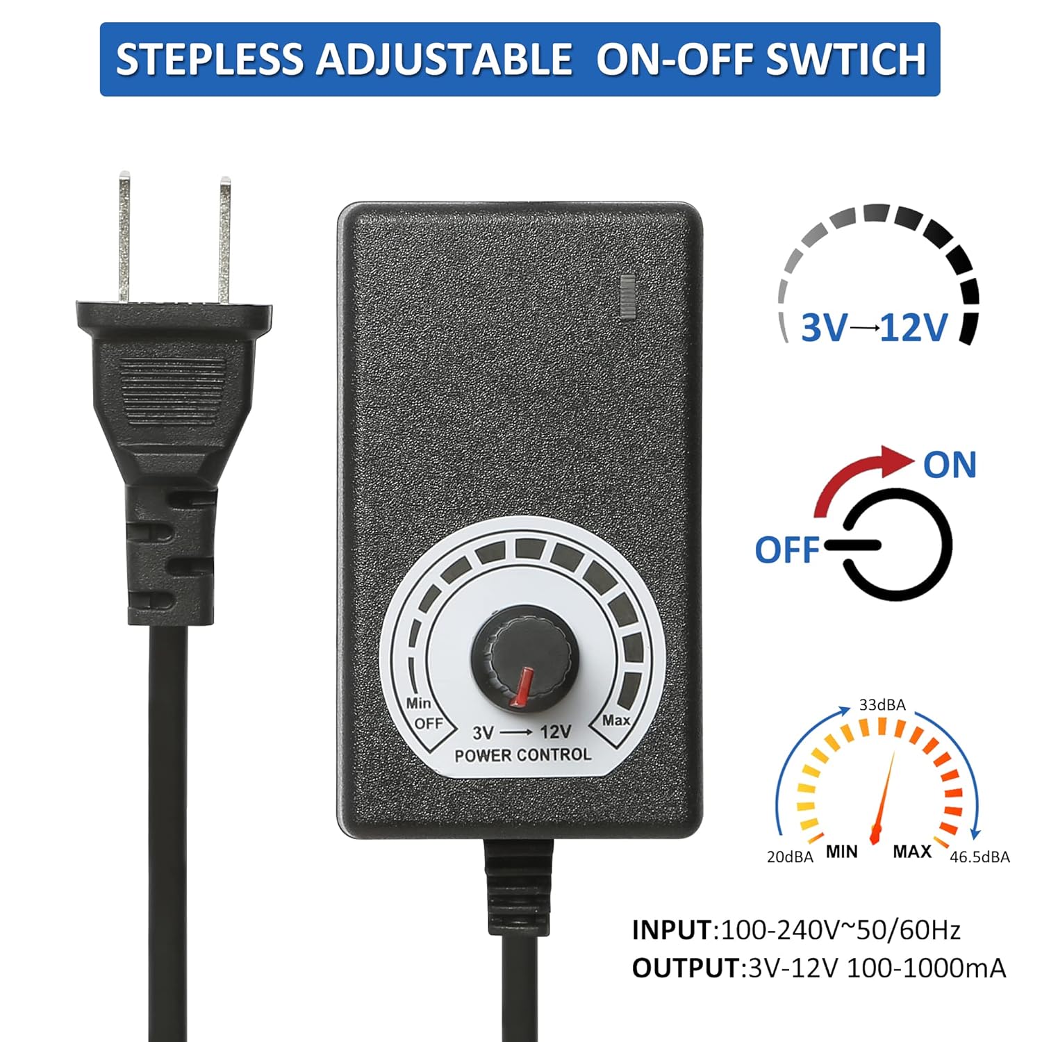 - 【Adjustable Speed Controller】The 120mm fan with 3V - 12V AC powered speed controller meets different airflow (28 - 88CFM) and noise (20 - 46.5dBA) requirements and supports 100V - 240V AC outlet power, just plug it into the outlet and start it up.