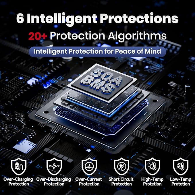 - ✅Upgrade with Low-Temp Protection: Equipped with a 50A BMS, this lithium battery offers comprehensive protection against overcharge, over-discharge, high-temperature, short-circuit, and overcurrent. It features a low-temperature cutoff, suspending charging below 0℃ and resuming at 5℃, and a discharge cutoff below -20℃. The self-recovery function restores the battery automatically after 30 seconds of overload