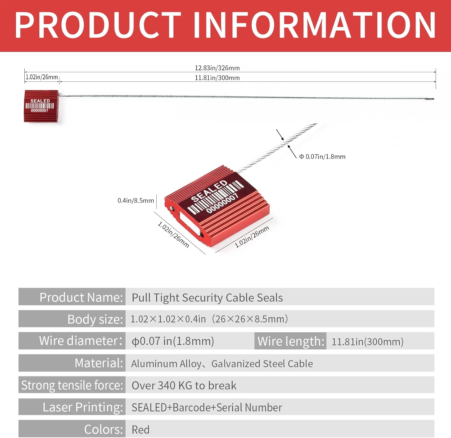 100 Red Steel Cable Seals With Barcode - High Security Numbered Truck Anti-Tamper Pull Tite Tags - Metal Container Shipping Self-Locking Safety Ties ISO 17712