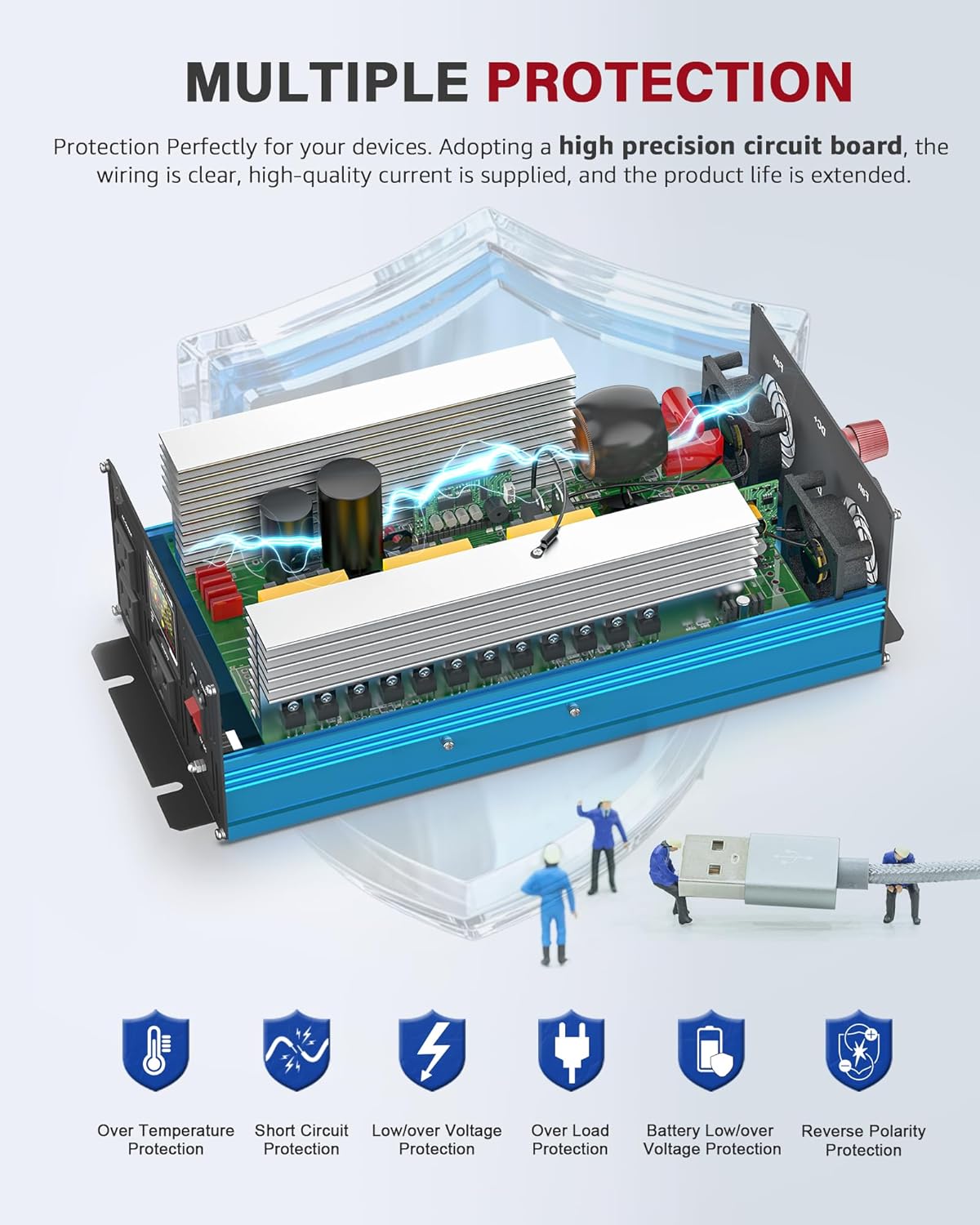 - 【FUSE & COOLING FAN PROTECTION】 The power inverters for vehicles has built-in fuse, which is protected from short-circuit current and reverse connection of battery terminals, and your battery will not be wasted due to overvoltage and overload. Built-in double intelligent fans can be automatically turn on when the power inverters becomes hot after no-load or power-on,so as to avoid safety accidents caused by overheating.