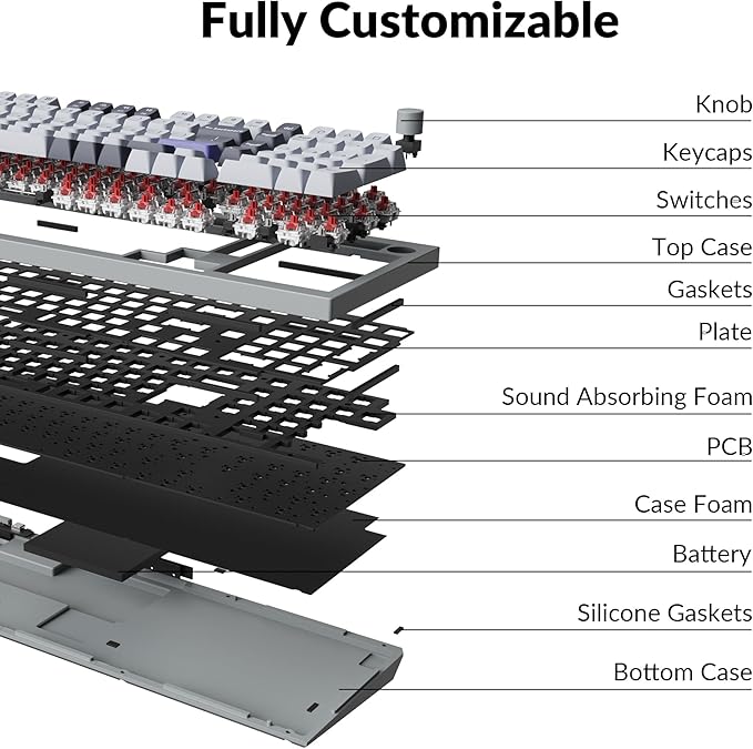 - Fully Customizable - Comes with a solid fully metal body, screw-in stabs, flexible PC plate and double-gasket, we designed every component to be able to assemble easily so you can customize and modify each component with ease to create your ultimate typing experience.