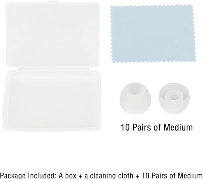 - ♫Package Included: A box, a cleaning cloth ,10 Pairs Medium replacement earbud tips