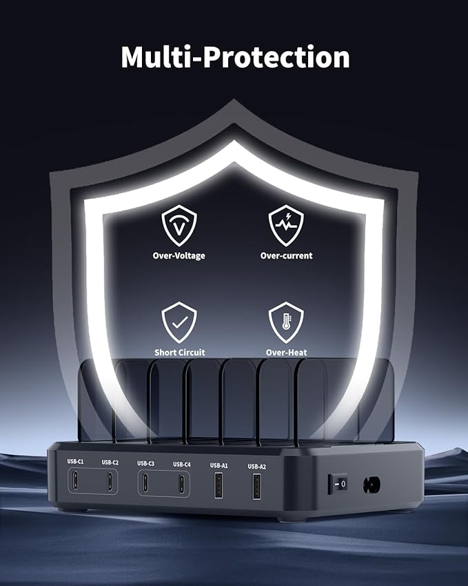 - Safe Protection & Intelligent Design: This phone charging station automatically identifies and distributes the appropriate power to each device, keeping your devices safely charged. It features a safety switch to completely cut off current from the wall charger, along with short-circuit, over-current, and over-temperature protection. Charge with confidence knowing your devices are fully protected