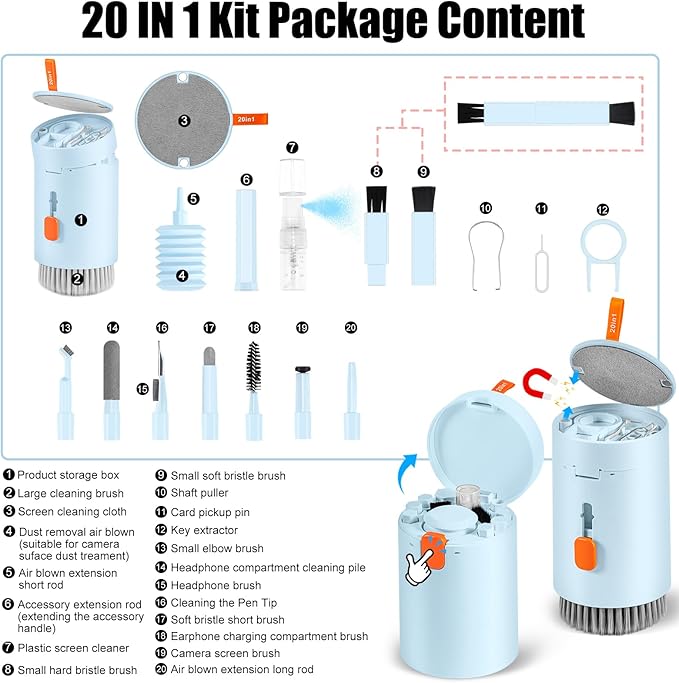 - 20 in 1 Keyboard Screen Cleaner Kit: The computer cleaning kit includes an Airpod cleaner pen, flocking sponge, mini soft brush, len brush, earphone case cleaning brush, and camera brush (All these brushes with the help of an extension rod which could use easier), screen cleaner spray, microfiber fiber cloth of the lid, retractable keyboard brush, keycap puller, shaft puller, air blower with 2 rods for extending, dual head brush (hard and soft bristle brush), card pickup pin.