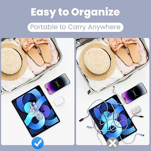 - [Convenient Design] With the useful sticky buckles for storage, this multi cord charger is easy to carry, perfect for home, car, office or travel.Super organizerd and no more messy charging cords tangled and tugged.Just carry one usb c multi cable for all your charging devices, making your desktop and bag more tidy.
