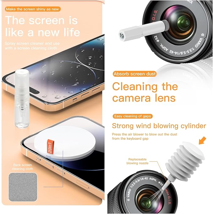 - 🚿【20-in-1 Keyboard Screen Cleaning Kit】: The computer cleaning kit includes retractable large brush, Airpod crevice cleaning pen, mini brush and flocked sponge brush, headphone case cleaning brush, charging port brush and camera screen brush, etc. (all of these brushes have extension rods for easier use). The cleaning kit also includes a screen cleaning cloth and spray bottle, keycap extractor, shaft extractor, 2 extension poles, blower, dual brushes (hard and soft bristle), and a card removal pin.