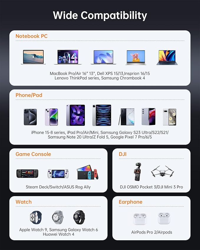 - Compatible Phone Models : Camera, powerbank, airpods, iwatch, Galaxy S22 / S22+ / S21 / S21+ / S20 / S20+ / S20 Ultra / S10 / S10e / S10+ / S9 / S9+ / S8 / S8+ / Note 20 Ultra / Note 20 / Note 10 / Note 9 / Note 8, LG G7 / V30+, Google Pixel / Pixel 3XL / 3 / 2XL / 2, Sony Xperia, and more., iPhone 15 / 15 Pro / 14 / 14 Plus / 14 Pro / 14 Pro Max / 13 mini / 13 / 13 Pro / 13 Pro Max / 12 mini / 12 / 12 Pro / 12 Pro Max / SE (2nd Gen), MacBook Pro 13 inch, MacBook Pro 14 inch, MacBook Pro 15 inch, MacBook Pro 16 inch, MacBook Air 13 inch, MacBook 12 inch 2020/2018, HP Spectre X360, Spectre X2, Spectre Folio, ELITE BOOK 830 G5, Dell XPS 13inch, YOGA730 / E490, ideapad 720s-13, THINKPAD X390; iPhone 15/ 15 plus/ 15 pro max, Huawei MateBook X Pro, MateBook X, MateBook13, iPad Pro 12.9, iPad Pro 11, New iPad Air 4, Compatible with Samsung Galaxy, Motorola, Google Pixel 5/4/3/2, Google Pixel 4XL/3XL/2XL, Google Pixel 4a/4a 5G/3a/3a XL Camera, powerbank, airpods, iwatch, Galaxy S22 / S22+ / S21 / S21+ / S20 / S20+ / S20 Ultra / S10 / S10e / S10+ / S9 / S9+ / S8 / S8+ / Note 20 Ultra / Note 20 / Note 10 / Note 9 / Note 8, LG G7 / V30+, Google Pixel / Pixel 3XL… See more
