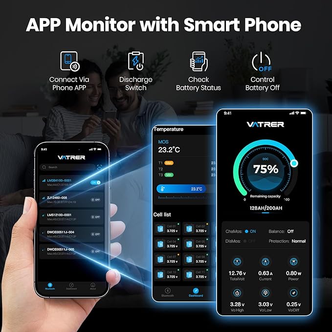 - 【Grade-A Cells & Upgraded 200A BMS】VATRER POWER 200Ah self-heating LiFePO4 batteries with Automotive Grade LiFePO4 cells have uncompromising quality and higher energy density with better stability, which makes it possible to ensure long-term recycling. And highest-level safety is based on UL Testing Reports for the cells inside the battery and upgraded BMS with heating pads to protect it from overcharging, over-discharging, over-current, and short circuits with excellent self-discharge rate.