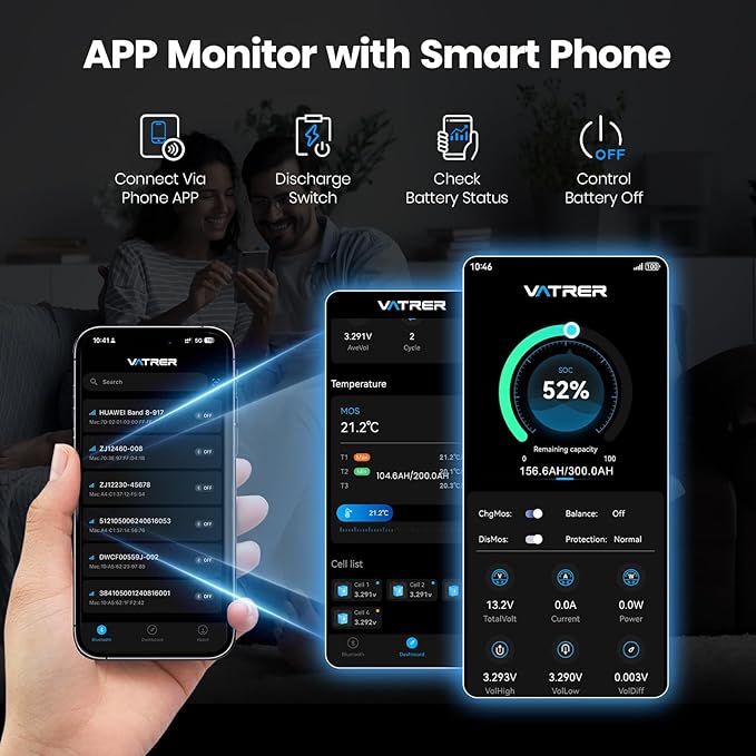 - 【Grade-A Cells & Upgraded 200A BMS】VATRER POWER 300Ah self-heating LiFePO4 batteries with Automotive Grade LiFePO4 cells have uncompromising quality and higher energy density with better stability, which makes it possible to ensure long-term recycling. And highest-level safety is based on UL Testing Reports for the cells inside the battery and upgraded BMS with heating pads to protect it from overcharging, over-discharging, over-current, and short circuits with excellent self-discharge rate.