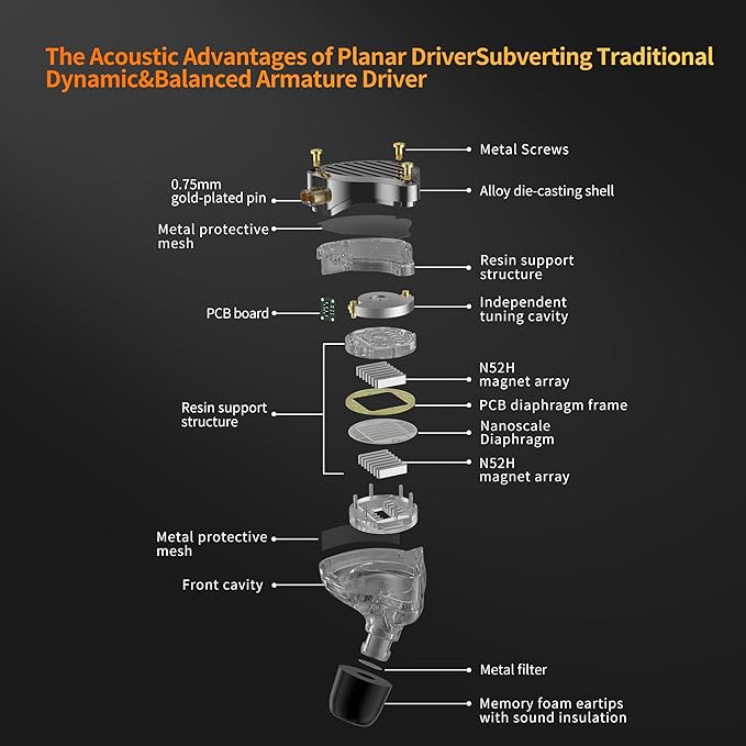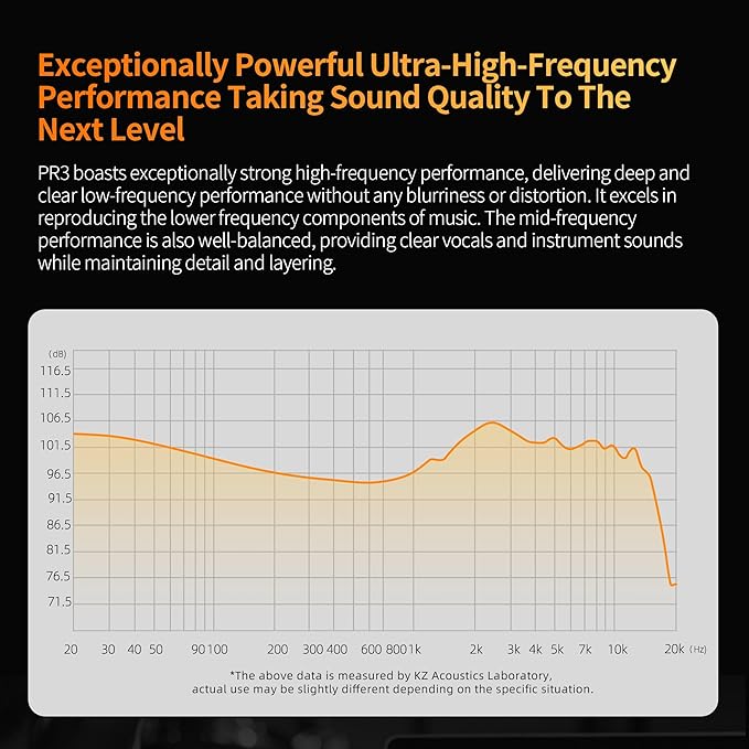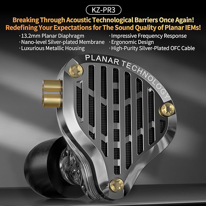 - 【13.2MM Planar Magnetic Driver】 KZ PR3 iem headphones are equipped with a new 13.2mm planar driver with far better high frequency and ultra-high frequency response than traditional balanced armature and dynamic units. it boasts exceptionally strong high-frequency performance, and delivers distortion-free deep and detailed low-frequency output. The mid-frequency range is well-balanced, providing clarity for vocals and instruments with maintained detail and layering.