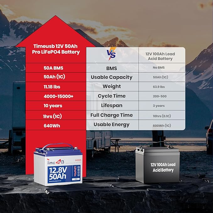 - 【GRADE A BATTERY CELLS】Timeusb 12.8V 50Ah Pro LiFePO4 battery are made with grade A battery cells, which allows the battery to be cycled up to 4000 times and provide up to 10 years of lifespan. At 80% DOD the battery’s cycle times can reach over 6000 times. At 60% DOD the battery’s cycle times can reach over 15000 times. Reliable quality battery made by Timeusb.