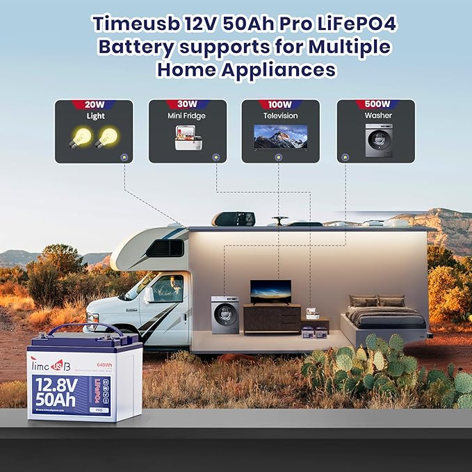 - 【RELIABLE & SAFE BMS】Even with the smallest size within Timeusb product line, the 12.8V 50AhPro battery still have the full-size BMS that provides the 100% safety guarantee as the other models. 50A BMS provides five types of protections from: overcharging, over discharging, over current, short circuit, and high-temperature. The BMS will cut-off when environmental temperature is above 60°C/140°F.