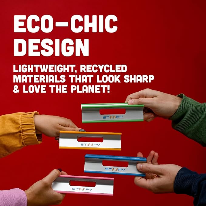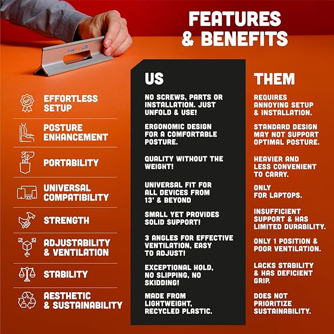 - SETUP'S A BREEZE - Just unfold and go—no screws, no hassle. Instant use, instant time saver! Steepy desk laptop stand is a travel laptop stand made out of strong and durable recycled plastic, with rubber edges to provide the sturdy and stable support your device needs and prevent it from sliding or skidding.