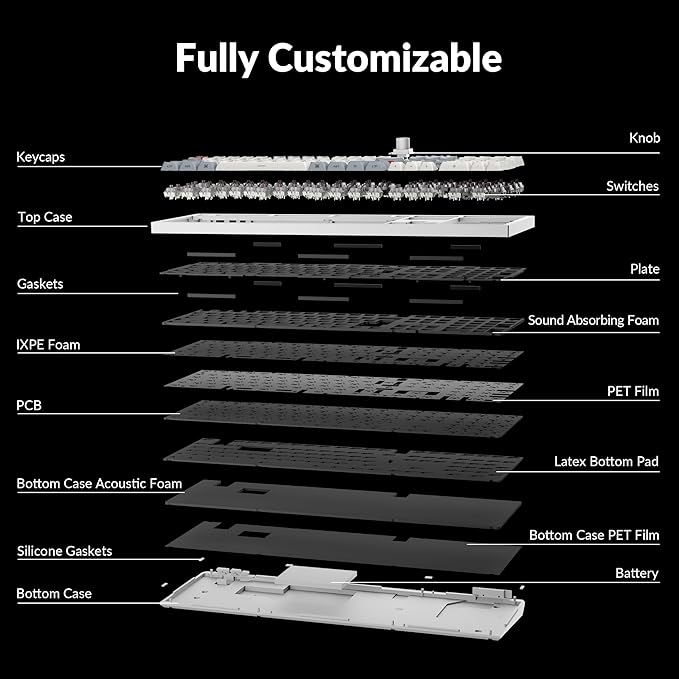 - Hot-Swappable - Every detail matters for a personalized typing experience, thatโs why we give you the power. You can hot-swap every switch on the Q6 Max with almost all of the 3pin and 5pin MX style mechanical switches on the market (including Cherry, Gateron, Kailh, Panda, etc.) without soldering required. You can customize your own typing experience in seconds.