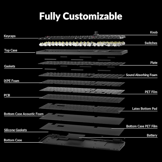 - Hot-Swappable - Every detail matters for a personalized typing experience, thatโs why we give you the power. You can hot-swap every switch on the Q6 Max with almost all of the 3pin and 5pin MX style mechanical switches on the market (including Cherry, Gateron, Kailh, Panda, etc.) without soldering required. You can customize your own typing experience in seconds.