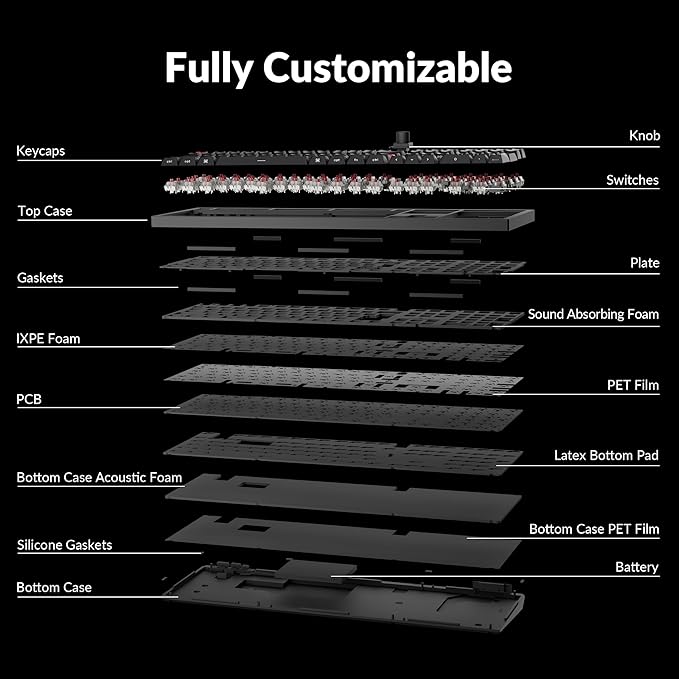 - Hot-Swappable - Every detail matters for a personalized typing experience, thatโs why we give you the power. You can hot-swap every switch on the Q6 Max with almost all of the 3pin and 5pin MX style mechanical switches on the market (including Cherry, Gateron, Kailh, Panda, etc.) without soldering required. You can customize your own typing experience in seconds.