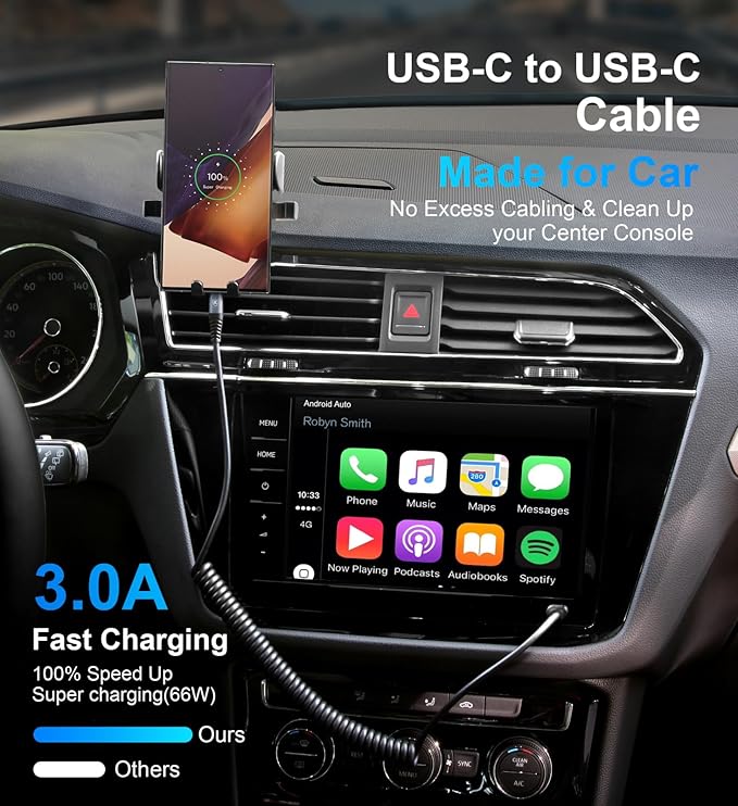 - USB C to USB C Cable Fast Charging for Car: Coiled type c car charger with spring shape design, portable and not tangled. It can well save the use of space in the car and say goodbye to the hassle of data cable clutter and tangles.