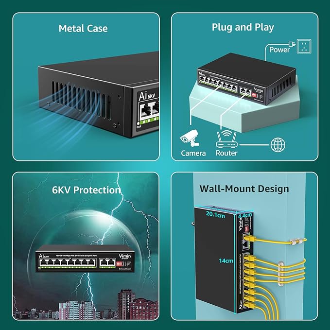 - 🌟Versatile Installation - VIMIN 8-port gigabit PoE switch comes in a sturdy metal casing, allowing for easy wall-mounted, or desk placement. Its plug-and-play design make it user-friendly right out of the box, providing a versatile networking solution for a variety of environments.