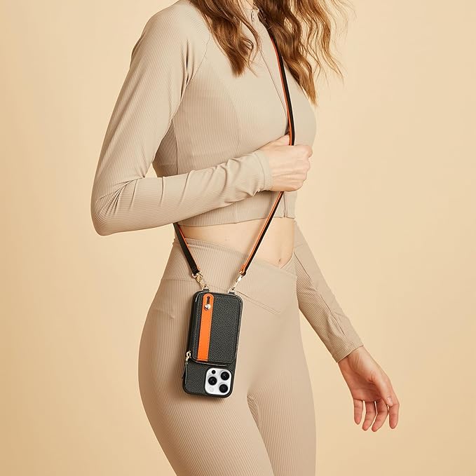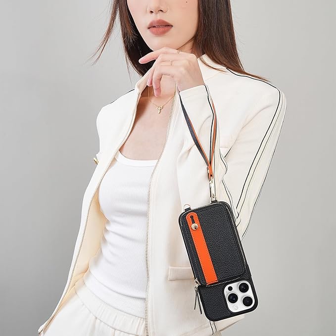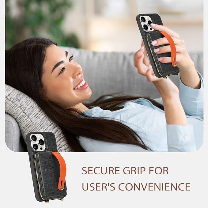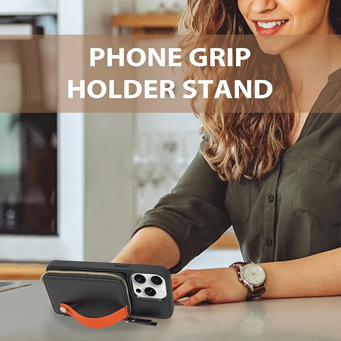 - LAMEEKU for iPhone Wallet Case with Card Holder, Zipper Leather Crossbody Case with Kickstand Wrist Strap Lanyard for Women, Cover Phone Grip Holder Stand