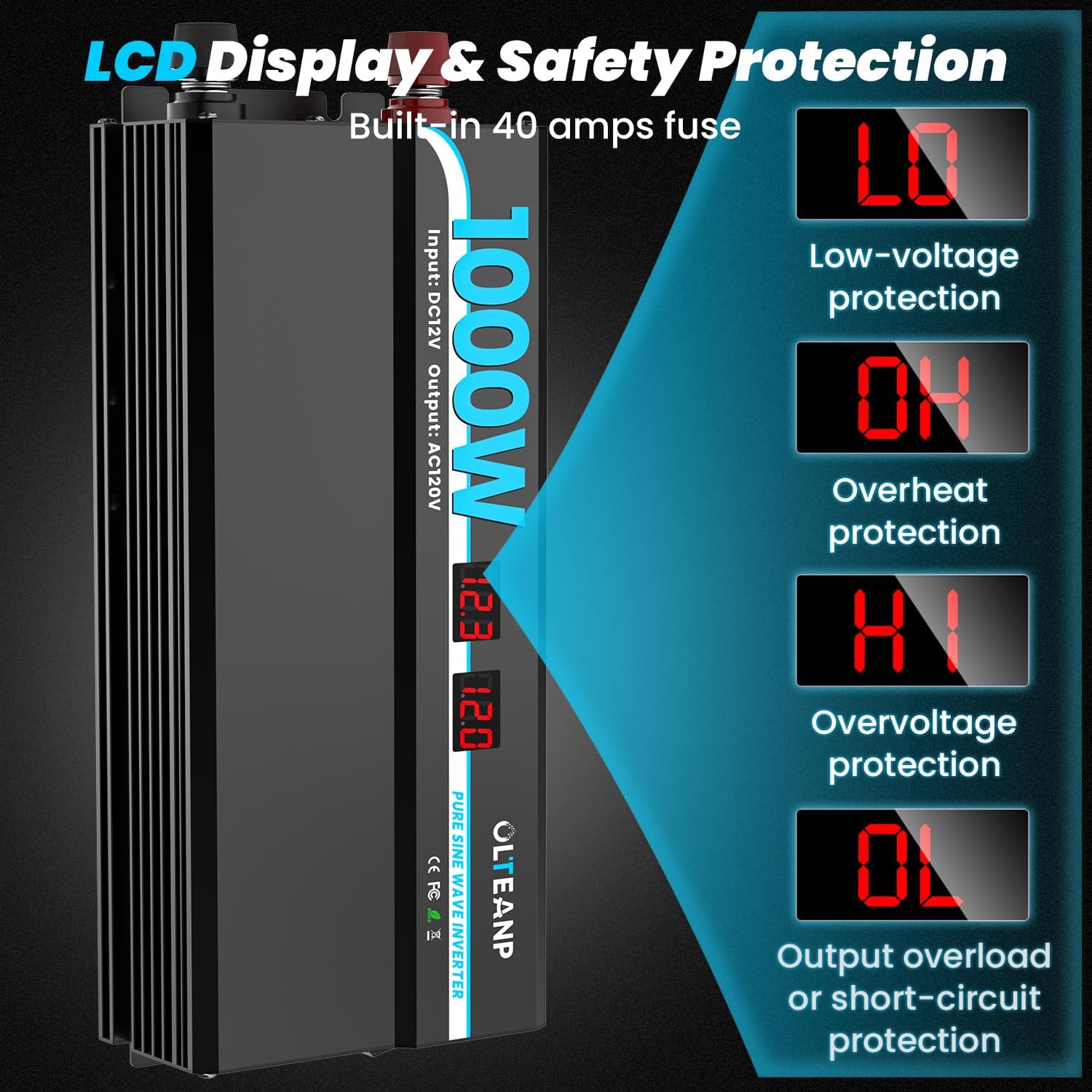 - 【LCD DISPLAY MASTER THE INVERTER WORKING STATUS】- You can get troubleshooting from the LCD display to adjust the inverter and your battery. It will show the LO(low voltage protection), OH(over heat protection), HI(over voltage protection), OL(output overload or short-circuit protection). Control the inverter status easily.