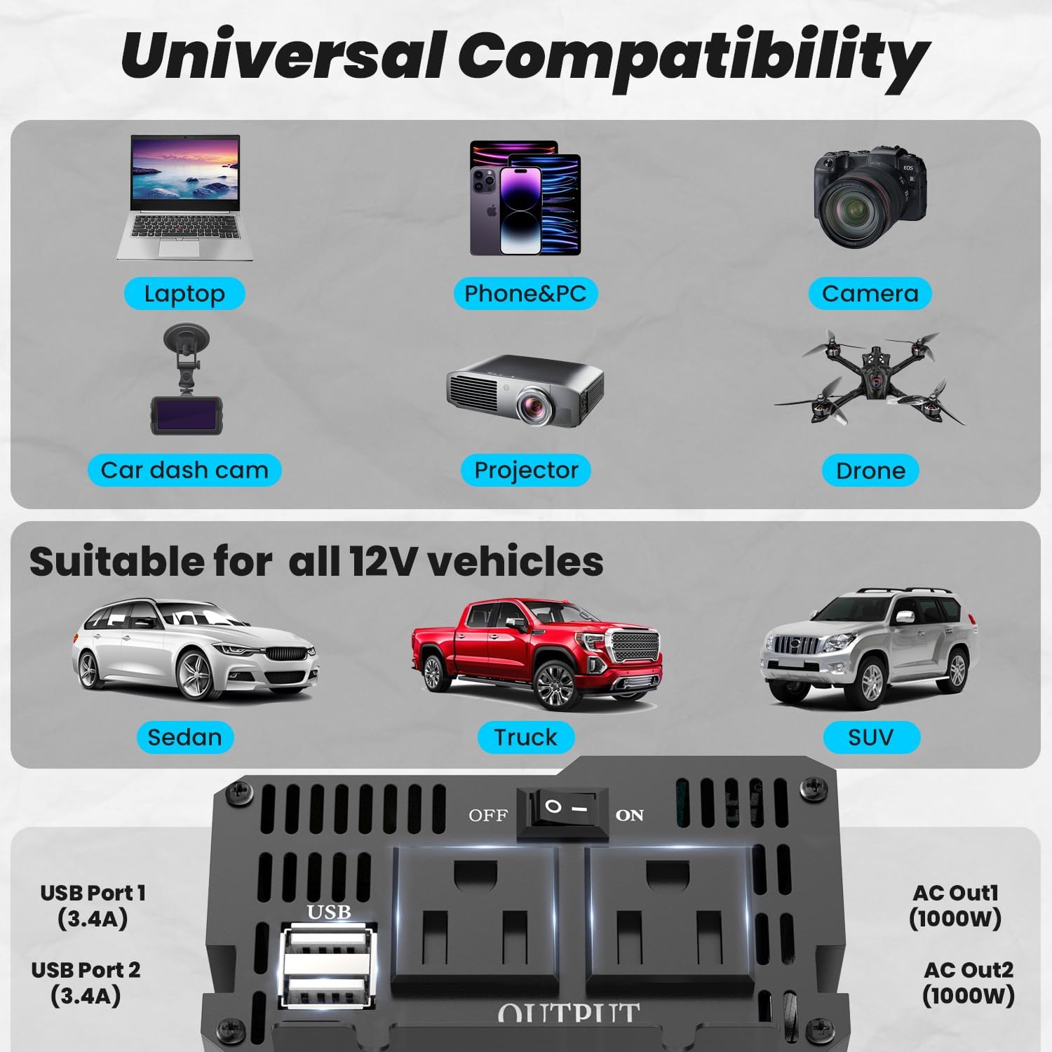 - 【POWERFUL 12V DC-110/120V AC CAR POWER INVERTER】- With professional and advanced technology 1000 watts pure sine wave power inverter, you'll be able to charge and power your smartphones, laptops, entertainment devices, small-sized appliances, and other mobile devices.