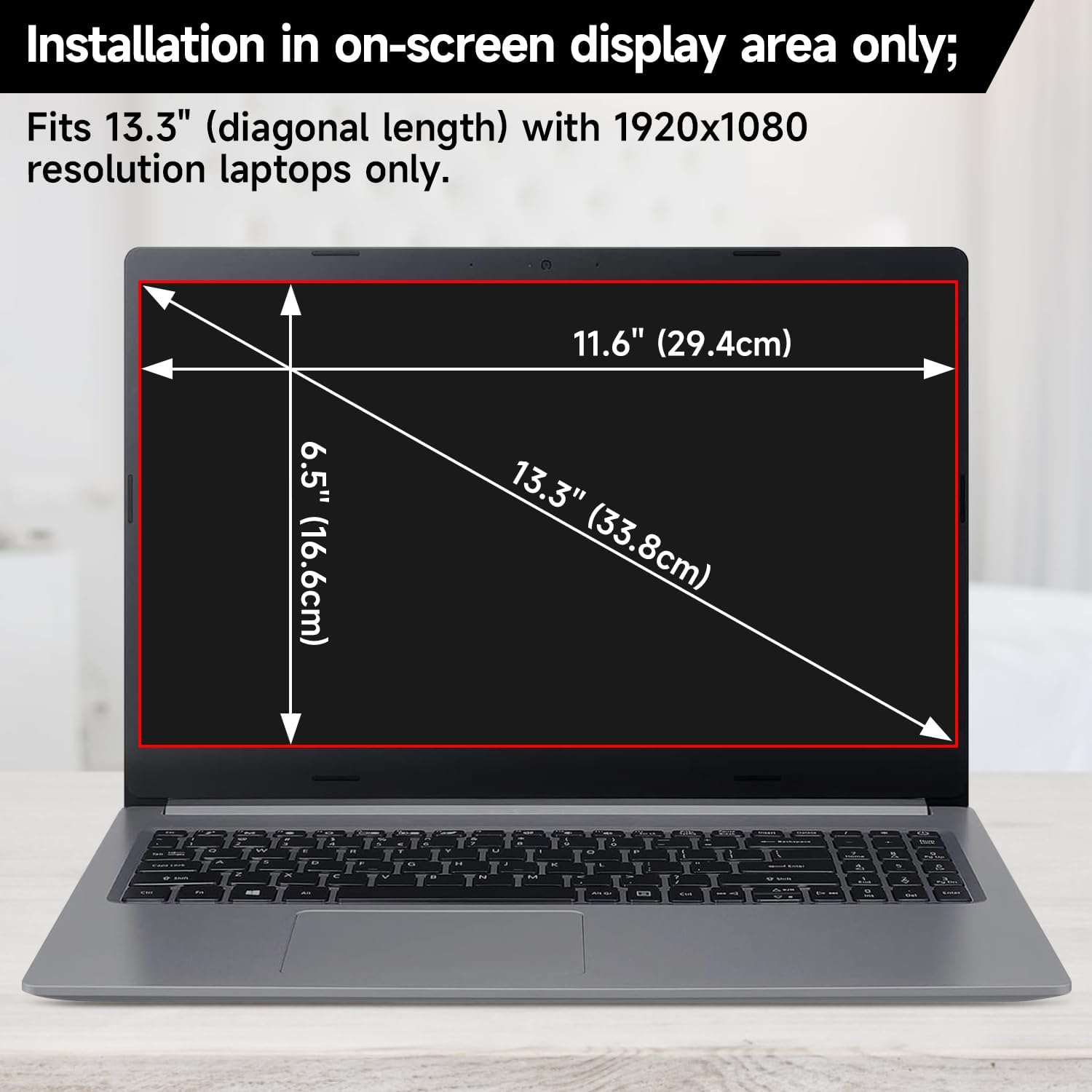 - ăCompatibilityăThis laptop privacy screen filter is specially design for 13.3 inch with Aspect Ratio 16:9 laptops (Not for 16:10 aspect ratio) -DIAGONALLY MEASURED 13â. The filter size (L x W) is 11.6 inch (29.4cm) x 6.5 inch (16.6cm). Please confirm your laptop model before purchasing. Also not fit for Any MacBook.