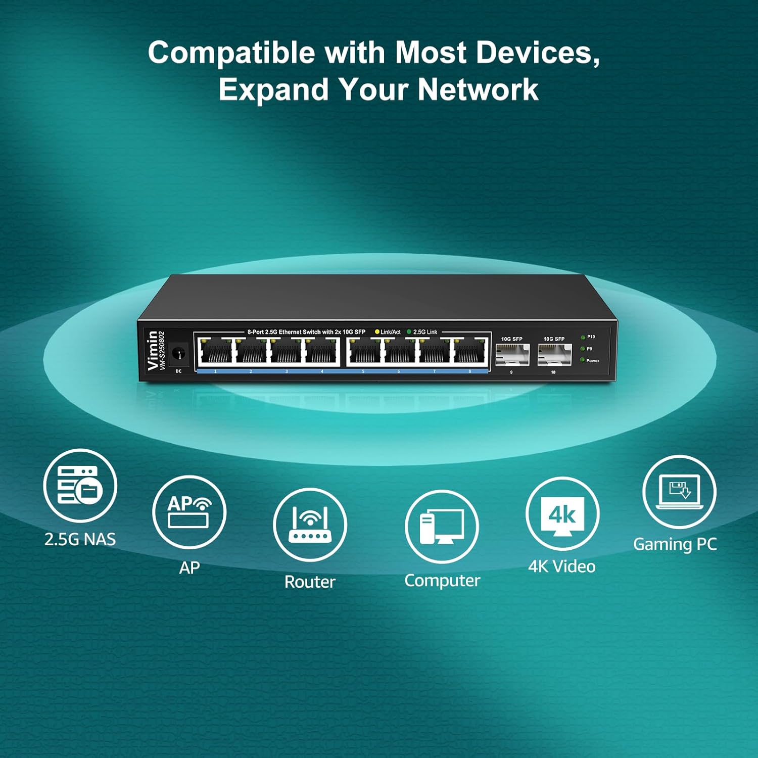 - ๐2.5G Network Connectivity: The VIMIN 10 ports 2.5g ethernet switch features 8x 2.5Gbps(8*10/100/1000/2500Mbps RJ45 ports) RJ45 ethernet ports and 2x 10Gbps SFP, The 2.5g switch providing high-speed and stable network connections to meet your needs.