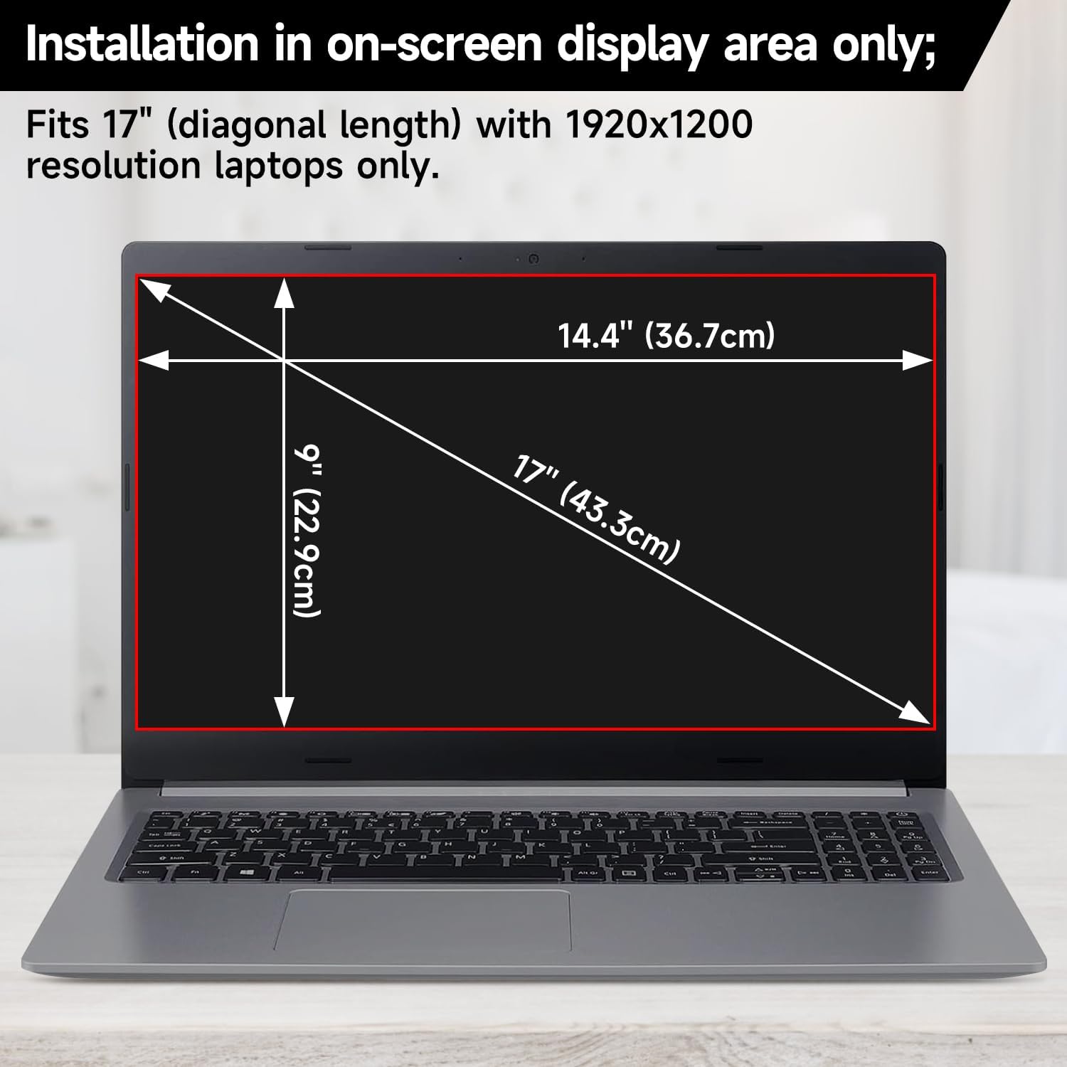 - ăCompatibilityăThis laptop privacy screen filter is specially design for 17 inch with Aspect Ratio 16:10 laptops (Not for 1920x1080 aspect ratio) -DIAGONALLY MEASURED 17â. Filter size(W x H): 14.4 inch (36.7cm) x 9.0 inch (22.9cm). Please confirm your laptop model before purchasing.