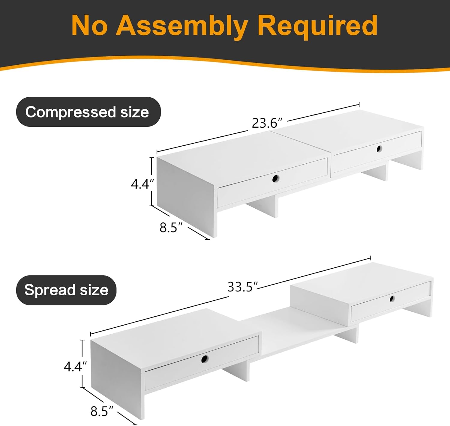 - Solid Wood | Compressed size: L23.6" x W8.5" x H4.4"; Spread size: L33.5" x W8.5" x H4.4" | Perfect for monitors, laptops, TVs, media speakers, etc.