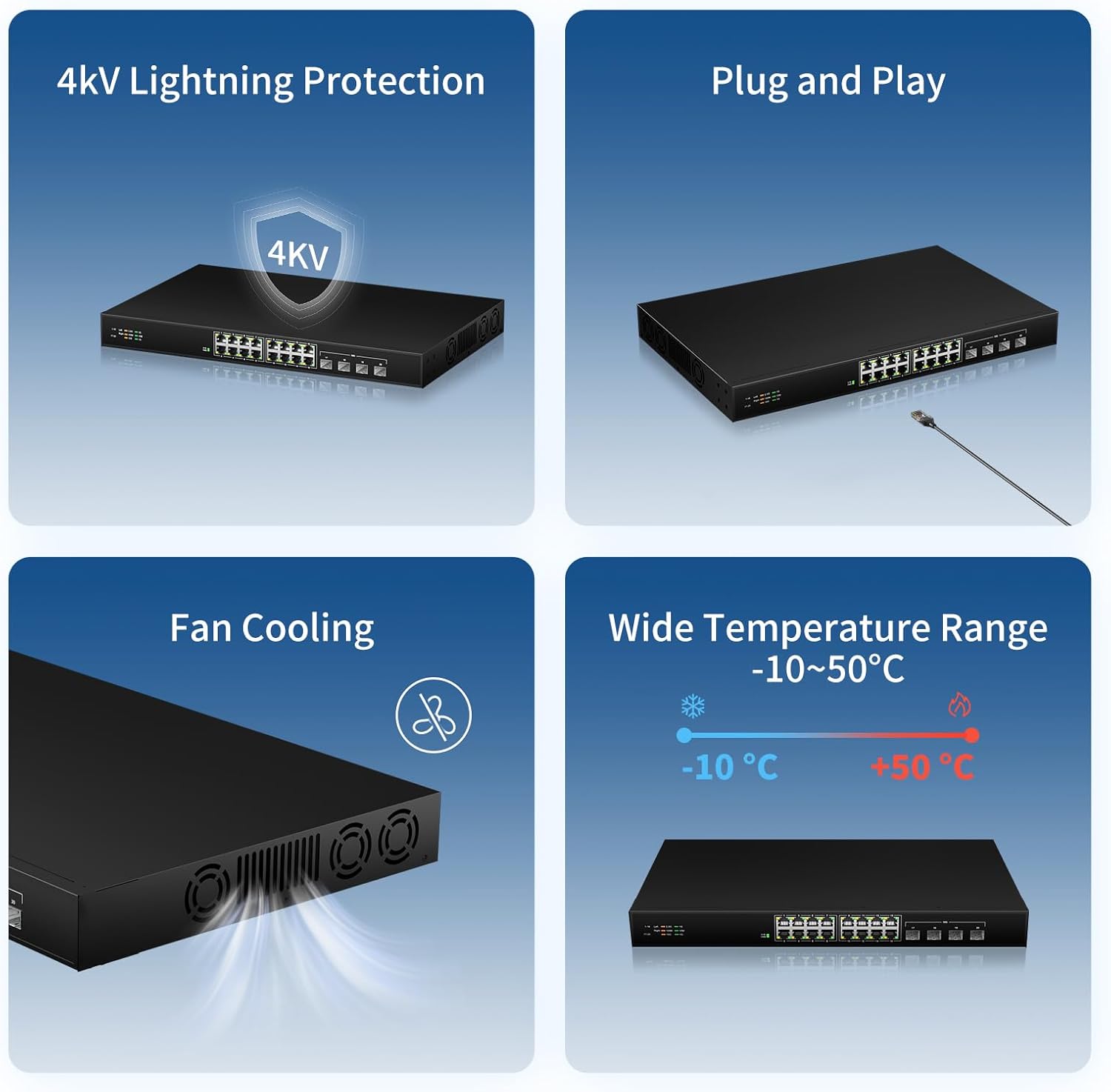 - 【Strong heat dissipation】Durable metal case, dual side cooling holes, built-in cooling fan can quickly improve the cooling effect of air on the switch, reduce energy consumption and ensure that the equipment maintains stable operation under a long period of high loads.