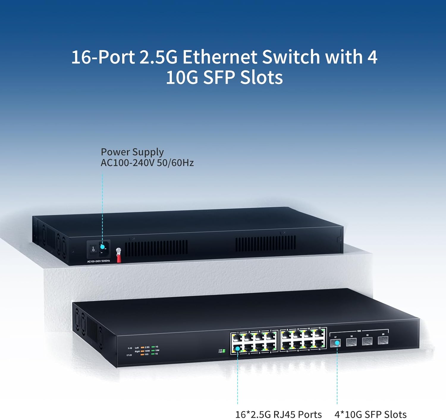 16 Port 2.5G Network Ethernet Switch, 16 x 2.5Gb RJ45 Ports, 4 x 10G SFP Slots, 240Gbps Switching Capacity, Desktop or Rack Mount/Metal Case/Fan Cooling/Plug and Play Unmanaged