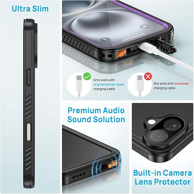 - 【 IP68 Certified Waterproof 】Lanhiem iPhone 16 Plus waterproof case. IMPORTANT NOTE: Please turn on the charging port switch at the bottom of the case to make the sound of the call clearer. Please test the waterproof case for iPhone 16 plus with the built-in waterproof paper towel before going underwater and make sure the front and back covers of the case are completely closed. Please click and refer to the product waterproof function test video below the product picture on the detail page