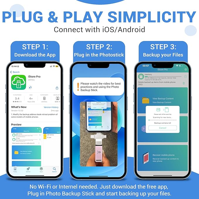 - Easy to Use and Set Up: Simply download the 'iStore Pro' app. Just plug iPhone backup stick into your device, the iStore Pro software scans your device, finds your media files, and saves them securely on the photo backup storage stick. The intuitive and user-friendly software makes it simple for anyone to back up and retrieve their files, even without technical expertise.