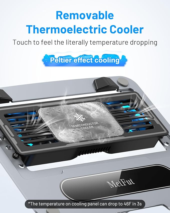 - 【Literally Temperature Dropping】Different from the traditional fan cooler, the METFUT cooling stand can cool down the temperature courtesy of thermoelectric cooling technology(Peltier effect). The cooler consists of a piece of semiconductor panel and 2 quiet fans. The temperature on the semiconductor cooling panel can drop to 47℉ in 3 seconds, which can cool down your laptop efficiently. *Please note: High humidity in the air or idling of the cooler may generate mist on the surface of the cooling panel.