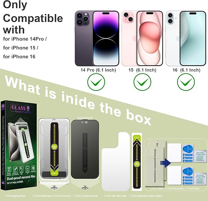 - Bubble-Free,Case-Friendly Fit: Designed for perfect fit and full case compatibility,this iPhone 14 Pro/15/16 screen protector offers sensitive touch response and stays bubble-free.Enjoy long-lasting,seamless protection that works perfectly with your favorite phone case