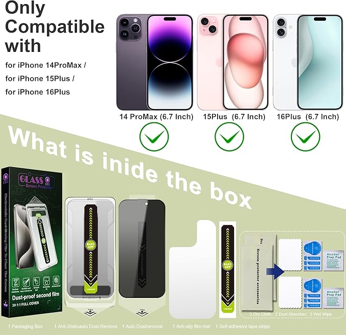 (2-Pack Anti-Spy Privacy Screen Protector for iPhone 14 Pro Max/15 Plus/16 Plus(6.7-Inch),9H Tempered Glass,Full Coverage,Anti-Fingerprint,Auto Dust Removal,Bubble-Free,Easy Installation