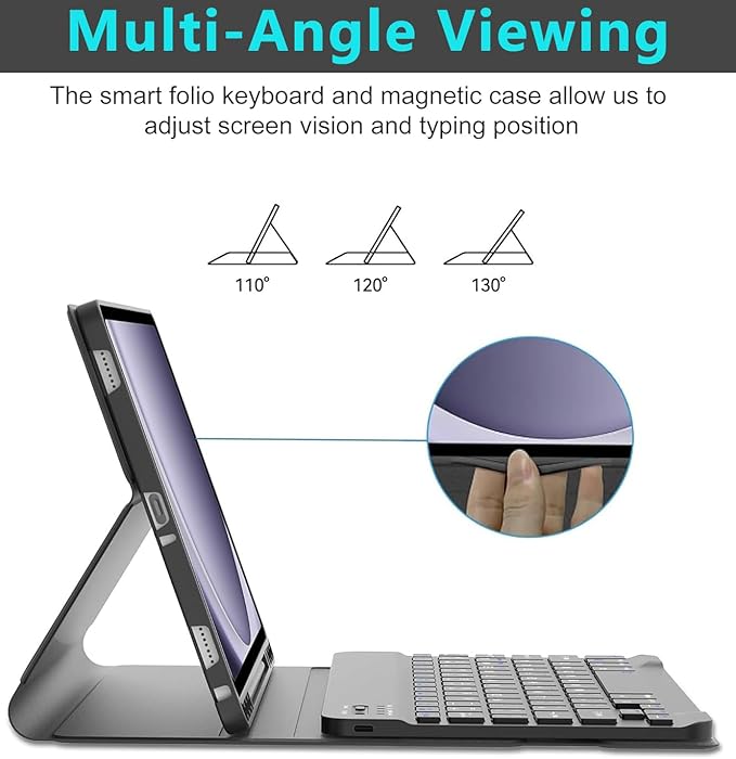 - ✅【Multi-angle view &Magnetic Detachable】This Samsung A9 plus tablet case keyboard has multiple viewing angles, allowing you to use the tablet at a comfortable tilt angle and enjoy reading, typing, sketching, chatting, etc. Wireless keyboard can be attached to the case magnetically. The keyboard is easy to attach and remove from the magnetic cover, simple and portable. Created to take your Galaxy Tab A9 Plus to the next level of everyday use.