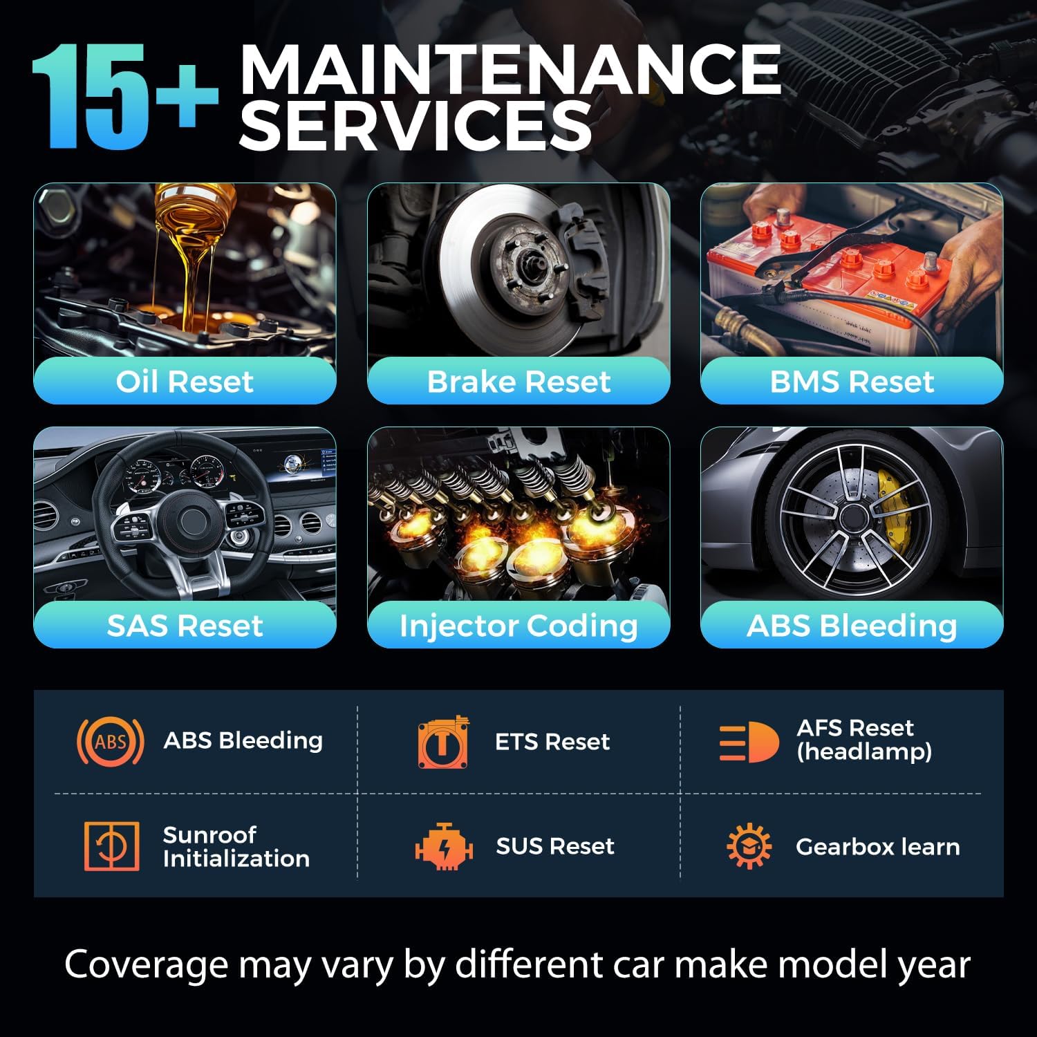 - 15+ Maintenance Resets: The current version introduces 15+ popular special features: Oil Reset, Headlight Matching, Bleeding Reset, TPMS Reset, BMS Reset, Gear Box Relearn, EGR Learning, Throttle Learning, Injector Coding, SAS Reset and more special functions in system diagnose menu. These functions make it easy for owners to carry out the necessary maintenance and servicing, ensuring that your vehicle stays in top condition, prolonging its service life and preventing common problems and breakdowns. Note: The Special function vary by model& year, Reach us check compatibility.