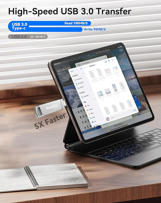 - 128GB Large Capacity: This USB flash drive for iPhone iPad offers 128GB of external storage, capable of storing up to 42,000 (3 MB) photos, 12 hours of 4 K (30 fps) video, or tens of thousands of music and document files. Supports JPEG, HEIC, PNG, GIF, MOV, MPEG4, and more.