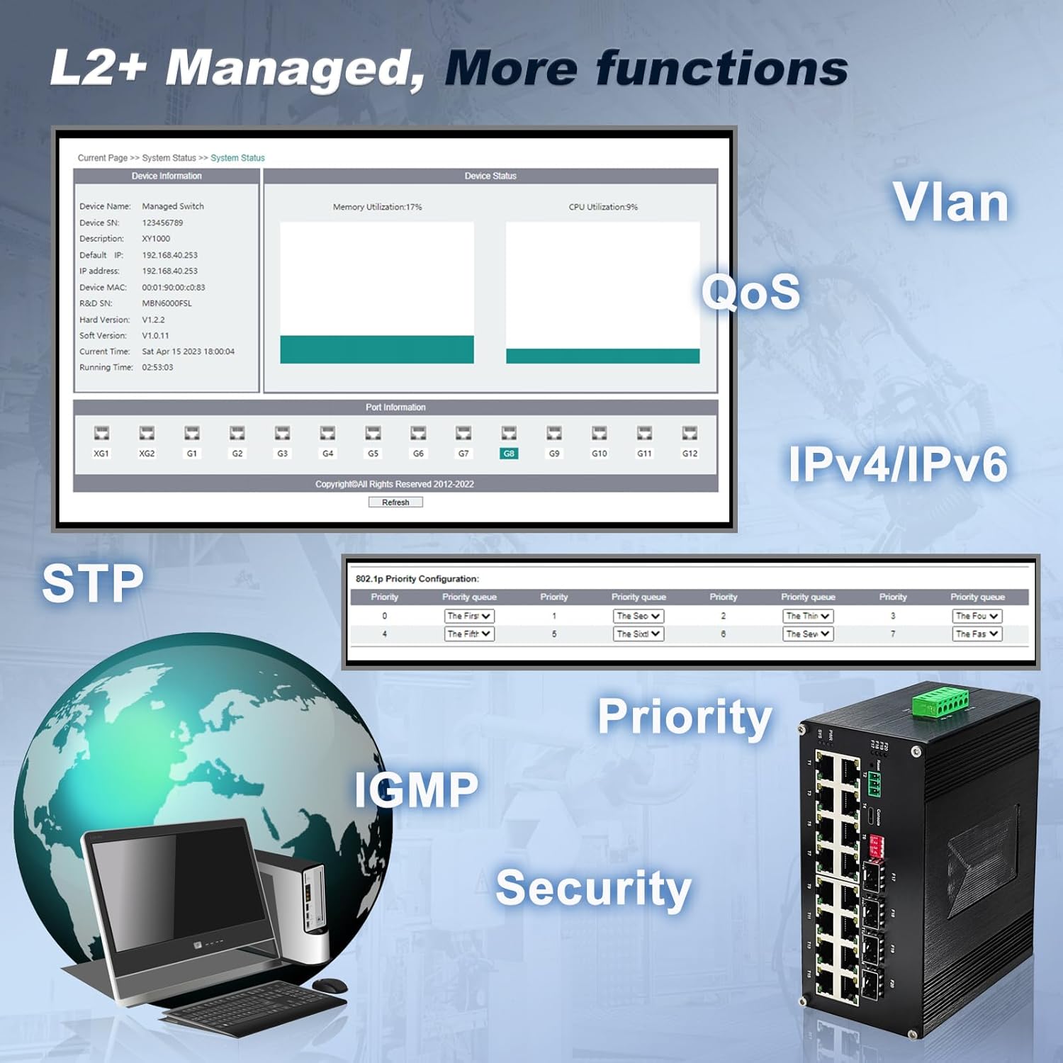 16-Port Gigabit Network Switch with 4 SFP Slot, L2+ Managed PoE Ethernet Switch, Support IEEE802.3af/at, Ring Network, VLAN, STP/RSTP, Plug and Play, Din Rail Installation